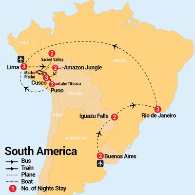 ✓ Incredible sightseeing, including the Incan treasure Machu Picchu, the Peruvian Amazon jungle, both sides of thundering Iguazu Falls, glamorous Buenos Aires and vibrant Rio de Janeiro