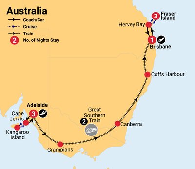 ✓ Incredible sightseeing, travel on the Great Southern through rugged wilderness and spectacular coastline, explore the beauty of two of Australia’s most iconic islands - Kangaroo Island & Fraser Island, discover the nation’s capital, explore the Grampians and Coffs Harbour