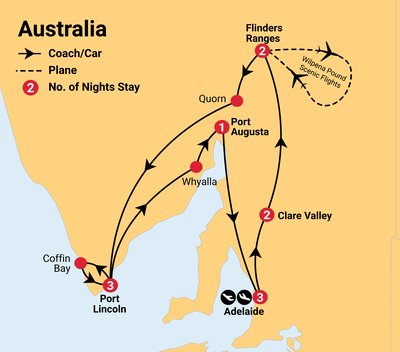 ✓ Incredible sightseeing. See the pinnacles of Wilpena Pound from the air, sample the delights of Coffin Bay, dine on fresh premium seafood in Port Lincoln, see the beauty of Port Lincoln National Park, witness the most spectacular coastal scenery and fall in love with Hahndorf and the Adelaide Hills