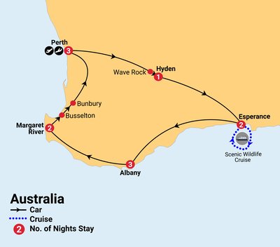 This morning, please make your way to AVIS city depot to collect your vehicle. Today will see you driving east towards Wave Rock. Your accommodation for tonight is at Hyden, only a short drive from Wave Rock.