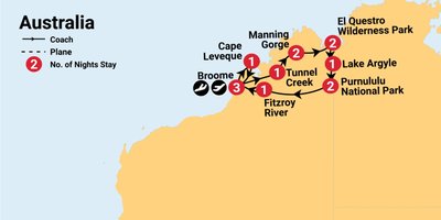 You may want to complete your Kimberley Expedition adventure with a full day plane & boat tour to the Horizontal Falls. This is a full day activity and it will require you to stay in Broome one extra night. This activity is on request and it operates on certain dates (depending on the tides). Should it not be available on Day 15 of this tour, you can request it on Day 1 of this tour instead - which will require you to arrive in Broome the previous day.
