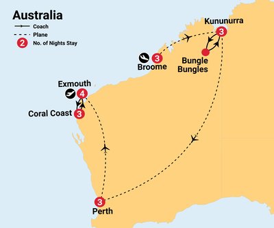 ✓ Incredible sightseeing, visit Cape Leveque and the Dampier Peninsula, travel the Kununurra and cruise the Ord River, fly to the Bungle Bungles and the Purnululu National Park, explore the Western capital of Perth, travel to the Coral Coast and witness Manta Rays before visiting the Ningaloo Reef