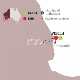 Cruise along the Swan River to Fremantle today before heading to Rottnest Island. Located 19 kilometres off the mainland, this car-free A-class nature reserve is home to spectacular white sandy beaches, secluded bays and unique wildlife. You’re sure to encounter a quokka, which can only be found on Rottnest. You’ll learn about its colourful history on a comprehensive circumnavigation of the island, stopping at some of Rottnest’s most spectacular locations, including the Wadjemup Lighthouse and the majestic lookout point at the rugged West End. After lunch, there’ll be time at leisure before boarding your ferry to Perth.