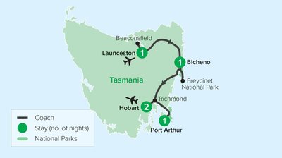 Home to pristine beaches, rugged landscapes and granite peaks, Freycinet is a place of breathtaking natural beauty. Explore the park and take in the stunning surrounds. Continue south to Richmond, home to the historic Richmond Bridge. Built by convicts in the 1820s, it is Australia's oldest bridge. On the way to Port Arthur, see how nature and time have created spectacular rock formations such as the Tessellated Pavement and Tasman Arch.