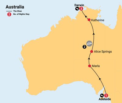 ✓ Incredible sightseeing, travel on The Ghan from Adelaide to Darwin through the fiery red centre en-route to Darwin