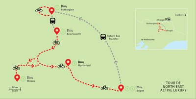 Cycle to Myrtleford, gourmet winery lunch with exclusive wine tastings. Overnight in stunning Villas with mountain views. Restaurant dinner.