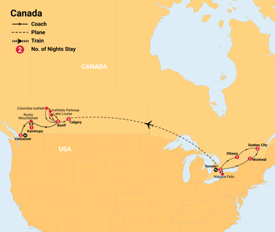 Explore the best of Canada on this unforgettable journey. Start with Toronto, Niagara Falls, Ottawa, Quebec, and Montreal’s rich history and vibrant culture. Then, marvel at the Canadian Rockies, including Lake Louise, Banff National Park, and the Icefields Parkway. Ride the iconic Rocky Mountaineer for a spectacular rail adventure. Get ready for the adventure of a lifetime—uncover Canada’s natural wonders and vibrant cities like never before!