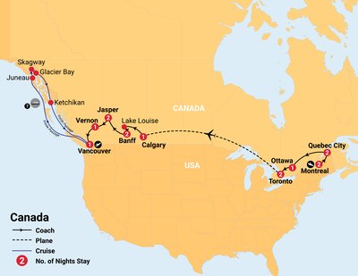 Discover Canada’s highlights from coast to coast, from vibrant cities and historic Quebec and Ottawa to mighty Niagara Falls. Explore Banff, Jasper, and Lake Louise, journey through the Rockies aboard the iconic Rocky Mountaineer, then relax on an Alaska Inside Passage cruise showcasing dramatic coastlines, wildlife, and unforgettable scenery.