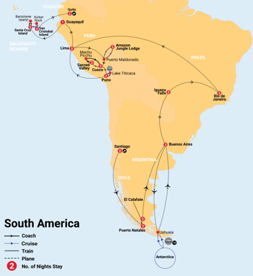 This comprehensive itinerary showcases the best of South America and Antarctica, from vibrant cities and iconic landmarks to the stunning Torres del Paine, Perito Moreno Glacier, and Galapagos. Experience nature's wonders with wildlife encounters, Amazon adventures, and unforgettable sites like Machu Picchu and Iguazu Falls.
