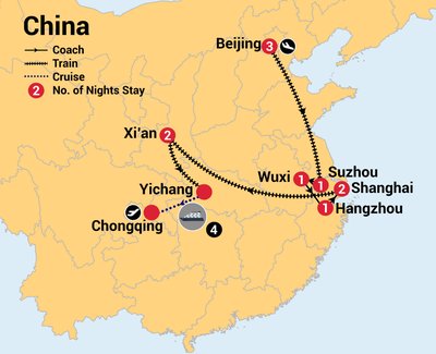 In the afternoon we continue on to Hangzhou, once described by Marco Polo as “the most beautiful and magnificent city in the world”. Upon arrival in Hangzhou you'll have the evening free to spend at your leisure: relax or take up our optional excursions, enjoying a performance.