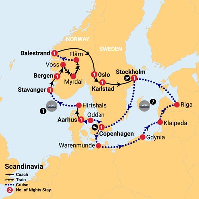 Set sail on a deluxe Baltic Sea cruise from Copenhagen, calling at Warnemünde, Gdynia, Klaipėda, Riga and Stockholm before returning to Denmark. Then explore Southern Scandinavia by land — ride the Flåm Railway, cruise the Sognefjord, and discover Bergen, Oslo and Stockholm on this fully escorted tour.