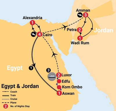 This tour will use a private coach, internal Domestic flights, an overnight train, cruise, and an international flight from Cairo to Amman. For coach journeys, where applicable there will be comfort stops along the way where you can freshen up, stretch your legs, use the bathroom and often, purchase refreshments. Generally, lunch stops will be taken at rest stops as they can easily accommodate our large groups.