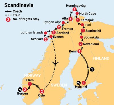 Discover Norway's beauty on this adventure through stunning landscapes and vibrant cities. Highlights include the Northern Lights, a glass-roof aurora cabin stay, a fjord cruise on the Nærøyfjord, and the iconic Flam Railway. Explore Lapland, the Lofoten Islands, and Bergen while enjoying husky sledding, cultural treasures, and breathtaking fjords.