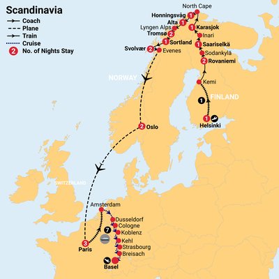 This tour spans Norway, Finland, France, the Netherlands, and Switzerland, so you will encounter different currencies along the journey: