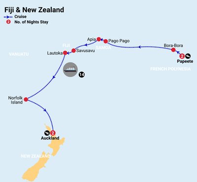 ✓ 14-night South Pacific cruise onboard Azamara Quest visiting Bora Bora, Pago Pago, Apia, Savusavu, Lautoka, Norfolk Island and Auckland