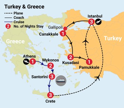✓ Incredible sightseeing including island hopping through stunning Mykonos, Santorini and Crete, then touring Turkey to discover Istanbul's grand icons, the mystical city of Troy, cliffs of Gallipoli and Pamukkale's white limestone thermal pools