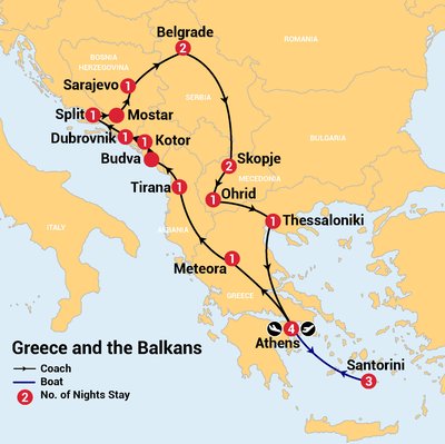 Today we leave Greece behind and head towards the Albanian border. En route we visit the UNESCO World Heritage-listed town of Gjirokastra, a rare example of a well-preserved Ottoman town complete with a 13th-century castle and many Byzantine churches and mosques. Later, we'll continue on to the capital, Tirana. A beguiling mix of Ottoman-, Fascist- and Soviet-era architecture, Tirana is also a surprisingly leafy city full of cafes and historic monuments. Pastel coloured buildings surround the city's focal point, Skanderbeg Square, which is named for its equestrian statue of a national hero. On the square's north end is the modernist National History Museum, covering prehistoric times through to communist rule and the anti-communist uprisings of the 1990s.