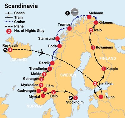 ✓ Incredible sightseeing, like Norwegian fjords, a reindeer farm, Santa Claus’ Village, city tours in Oslo, Stockholm and Helsinki
