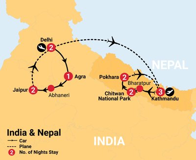 ✓ Incredible sightseeing including bustling Delhi, the iconic Taj Mahal in Agra, Jaipur's Amber Fort and Palace of the Winds, the Abhaneri Step Well, spiritual Kathmandu, the stunning Annapurna Ranges and wildlife spotting in Chitwan National Park