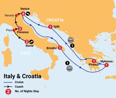 ✓ Incredible sightseeing including St. Peter’s Square, Colosseum, Leaning Tower, 13th Century Palazzo Vecchio, Ancient Roman Arenas, St Marks Square, Piraeus Port, Diocletian buildings & the famous white Windmills of Mykonos.