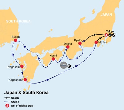 Discover the beauty of Japan and South Korea on a captivating voyage blending ancient traditions with modern cities. From Kyoto’s temples and Mount Fuji’s iconic landscapes to the cultural charm of Busan and Nagasaki, this journey is perfectly paired with a Tokyo stay to begin and end your adventure in style.