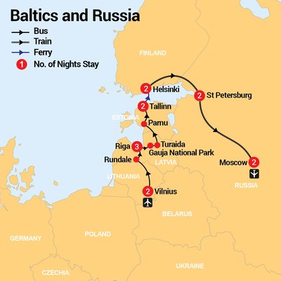 This is a partially escorted tour. From Vilnius to Tallinn you will join up to 24 other travellers on an escorted group tour. From Tallinn to Moscow, you will be on a self-guided journey, making your own way to some railway stations and to and from the start/finish points of included activities. During the self-guided portion of your tour you will have access to a local phone number, with 24/7 access should you require any assistance.