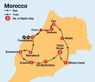 Salaam Aleikum! Welcome to Morocco. Your adventure begins today with a welcome meeting at 6 pm. As there's little free time included in Casablanca on this trip, to fully explore the city consider coming a day or two earlier. Modeled after Marseille in France, the city is famous for its art deco buildings and the modern-day masterpiece, the Hassan II Mosque. A pleasant way to spend the day exploring Casablanca is to wander the old medina and the city walls, then jump in a taxi to visit the Quartiers des Habous, the new medina. Finish the day with a walk along the Corniche, watching the locals play football on the beach, or take it easy with a glass of sweet mint tea in one of the many great cafes. It’s very important that you attend the welcome meeting as we will be collecting insurance details and next of kin information at this time. If you are going to be late please let your travel agent or hotel reception know. Ask reception or look for a note in the lobby for more information on where the meeting will take place. If you can't arrange a flight that will arrive on time, you may wish to arrive a day early. We'll be happy to book additional accommodation for you (subject to availability).