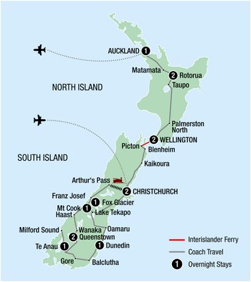 Airport transfers in New Zealand are included on the first and last day of your tour. This includes any pre or post tour accommodation directly linked with the tour hotel. Transfer vehicles will wait up to 1 hour after the flight lands in New Zealand.