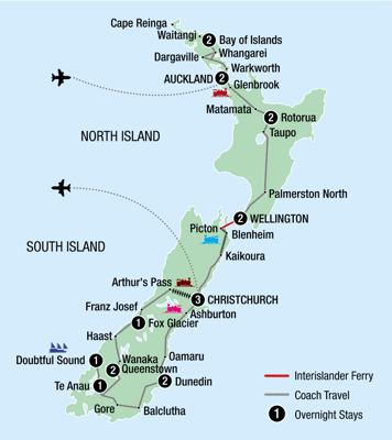 Airport transfers in New Zealand are included on the first and last day of your tour. This includes any pre or post tour accommodation directly linked with the tour hotel. Transfer vehicles will wait up to 1 hour after the flight lands in New Zealand.