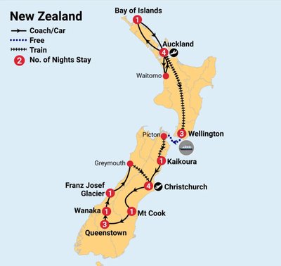 ✓ Incredible sightseeing! Visit Bay of Islands, Waitomo and Hobbiton, travel on one of the world’s most scenic rail journeys, go whale watching and visit New Zealand’s famous glaciers and national parks