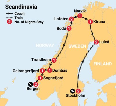 ✓ Incredible sightseeing including city tours in Stockholm, Trondheim and Bergen, see the church village of Gammelstad, visit the world famous ICEHOTEL in Kiruna, get up close to Abisko National Park in the heart of Swedish Lapland, explore in depth the stunning Lofoten Islands - including a stay in a traditional fisherman’s hut, ride the brand new Romsdal Gondal high above the Romsdalfjord and cruise along the UNESCO heritage listed Geirangerfjord, Sognefjord and Nærøyfjord.