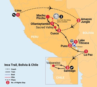 ✓ 12 nights of hotel accommodation at 3 & 4 star properties, 2 nights at Jungle Lodge, 3 nights camping on the Inca Trail (or hotel accommodation for non hikers), 1 night homestay in Lake Titicaca.