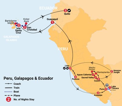 ✓ 24 nights in 3 & 4-star accommodation including a feature homestay in Lake Titicaca, 2 nights at a eco-friendly lodge in the Amazon and 4 nights in the Galapagos National Park