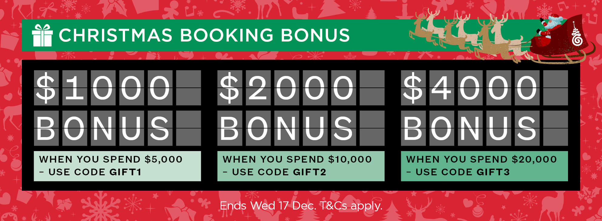 Get money off your current booking, plus a future travel voucher worth up to $1,500 with our exclusive Christmas Booking Bonus.