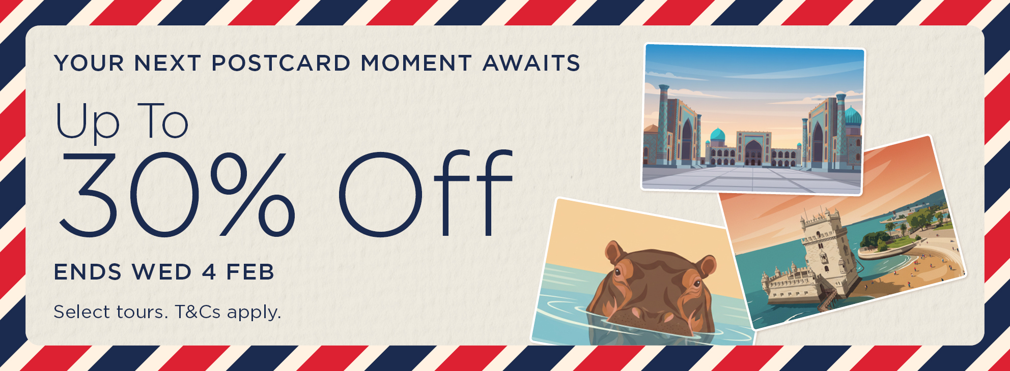 Step into a postcard with up to 30% off your next holiday.