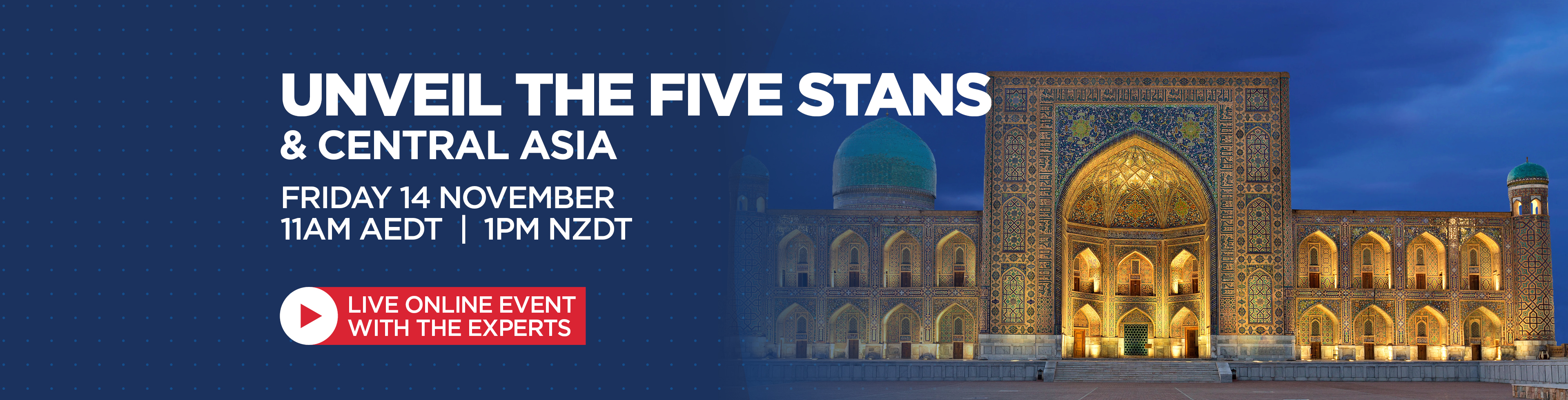 Join us for a fascinating online journey through the Five Stans: Turkmenistan, Uzbekistan, Tajikistan, Kyrgyzstan, and Kazakhstan.
