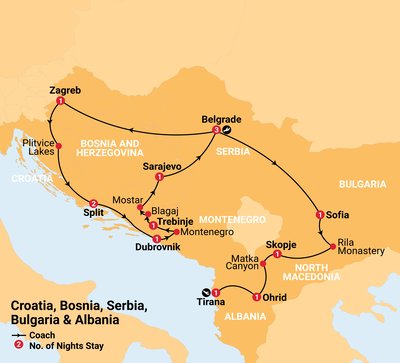 This tour covers Serbia, Croatia, Montenegro, Bosnia, North Macedonia, Albania, and Bulgaria using a private coach. All coach journeys are designed with comfort in mind, and regular stops are scheduled along the way to allow you to stretch your legs, use restroom facilities, and purchase refreshments. Lunch stops are generally planned at rest areas that can easily accommodate groups, ensuring a smooth and relaxed travel experience.