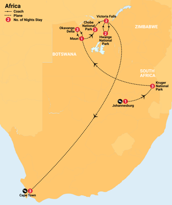 ✓ Internal flights from Johannesburg to Kruger, Kruger to Maun, Maun to Chobe National Park and Victoria Falls to Cape Town