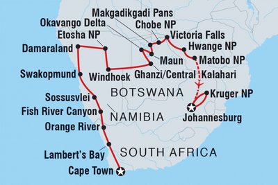 This is a combination trip made up of three shorter trips. This means the composition of your group may change in Windhoek and Victoria Falls as some group members (and the group leader in Vic Falls) leave and new ones join you.