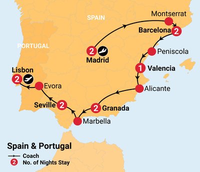 ✓ Incredible sightseeing including city tours of Madrid, Poblet, Barcelona, Valencia, Granada, Seville & Lisbon as well as visits of Las Ventas bullring in Madrid, Poblet Monastery, Poble Espanyol in Barcelona, Generalife in Granada, Chapel of Bones in Evora and others Train and visit to Montserrat Monastery