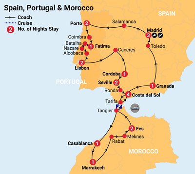 ✓ Incredible sightseeing including a Douro River cruise in Porto, Madrid, Lisbon, Cordoba (Mosque entrance included), Seville (including the magnificent cathedral), Granada’s Alhambra, the old town of Toledo, Morocco’s delights including Casablanca, Marrakech, Rabat and Fes