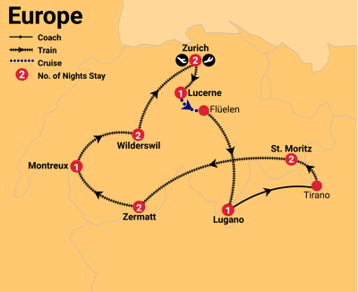 ✓ Incredible sightseeing! Tour Switzerland by world-famous rail journeys, experience the alpine wonderland of Jungfraujoch – Europe’s highest railway station, explore cosmopolitan cities like Zurich and charming Swiss villages and resort destinations like Lucerne, Lugano, St. Moritz, Montreux and Interlaken