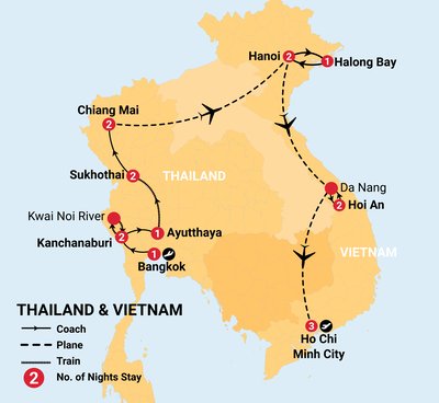 Explore Thailand and Vietnam’s cultural highlights over 17 exciting days: sightseeing tours through Bangkok’s Grand Palace, board a historic train over the River Kwai, city tour of Chiang Mai, local Thai-style cooking class, a guided tour of Hanoi, an overnight Halong Bay cruise, and experience the charm of Hoi An. End the tour with Ho Chi Minh City’s vibrant sights and a visit to the iconic Cu Chi Tunnels.