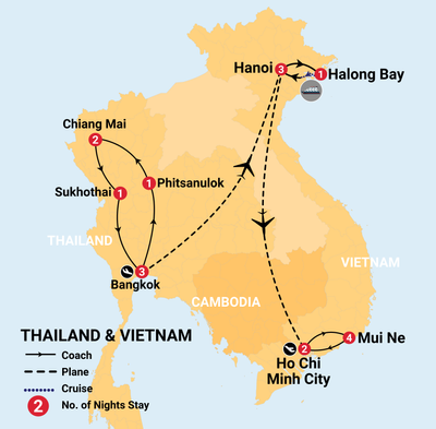 ✓ Incredible sightseeing, including exploring the historic city of Ayutthaya, temple hopping through central Thailand, Chiang Mai city tour, discovering the ruins at Sukhothai historic park, strolling around the vibrant capital Hanoi, overnight cruise in Halong Bay, exploring Ho Chi Minh City & a relaxing beach break in quite Mui Ne