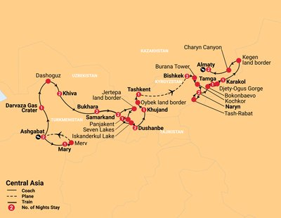 Due to local regulations in Turkmenistan, a maximum of one night pre-tour accommodation is available in Ashgabat. Arranging your own accommodation is prohibited, you must have all arrangements booked with Inspiring Vacations to avoid denied entry