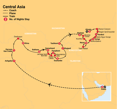 ✓ Explore Dubai and the famous 5 Stans of Central Asia: Turkmenistan, Uzbekistan, Tajikistan, Kyrgyzstan, and Kazakhstan