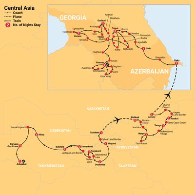 ✓ Explore the famous 5 Stans of Central Asia: Turkmenistan, Uzbekistan, Tajikistan, Kyrgyzstan and Kazakhstan and the South Caucasus: Georgia, Armenia and Azerbaijan