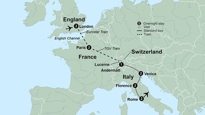 ✓ Discover all the must-sees of England, France, Switzerland and Italy