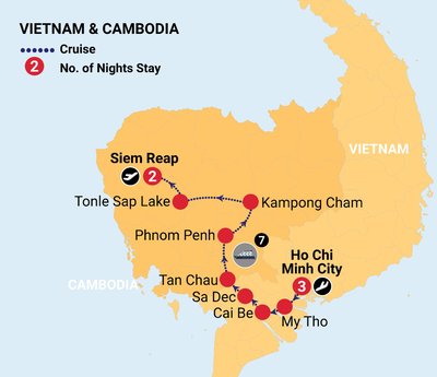 After breakfast, head ashore for an excursion around Tan Chau by “xe loi”, a cyclo used as a local taxi. Explore local streets, spotting traditional houses and workshops before stopping at a colourful market for a spot of shopping. Afterwards, board a local boat to visit a floating fish farm to learn how farming works. Back on board, continue your cruise towards Phnom Penh, with the rest of the afternoon at leisure. Dinner is served before arriving in Phnom Penh, capital of Cambodia.