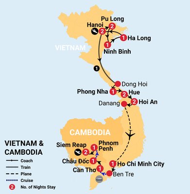 This tour features a curated selection of 3-4-star hotels and resorts throughout Vietnam and Cambodia, an overnight cruise and an overnight train. Each accommodation has been carefully chosen based on a stringent set of criteria, ensuring the high standards of comfort and convenience. Accommodation in Vietnam and Cambodia can differ from what you might be used to at home, but rest assured, we carefully select options to ensure your stay is both comfortable and enjoyable.